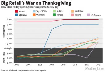 Best Buy is not even close to alone with its cold-hearted greed. The chart above shows exactly how America's biggest stores have actually competed in recent years to attract crazed shoppers at the expense of their particular employees—not to mention the one holiday in which we're likely to contemplate being grateful for just what offering, instead of just coveting more things.